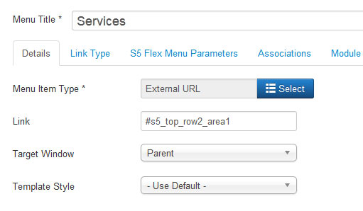 Screenshot of admin area of an external menu item with DIV reference entered: