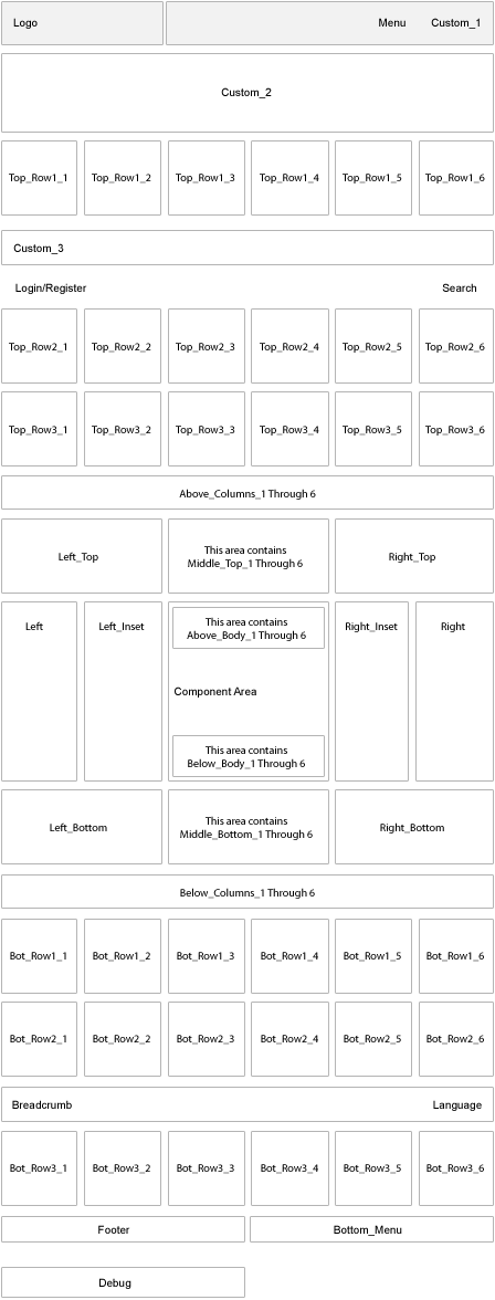 Because there are so many module positions available in so many different areas, the number of layouts you can create are limitless! For example, if you would like to show your main content area on the right side of your site but still have a column of modules, simply published your modules to the right or right_inset positions or both. The same would be true for the opposite, if you want a column on the left simply publish modules to left or left_inset. Of course you can always choose to not have a column at all. Remember, any module not published to will automatically collapse and the remaining area will automatically adjust. There is no need to choose a pre-defined layout for your entire site, simply use the power of collpasing module positions and take advantage of the numerous amount of module positions to create any layout you can dream of! Be sure to checkout the layout of modules below.